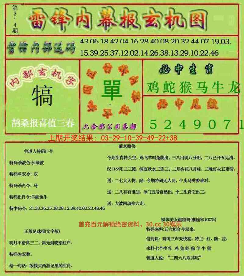 311期:家野两肖家禽+〗开:蛇37准