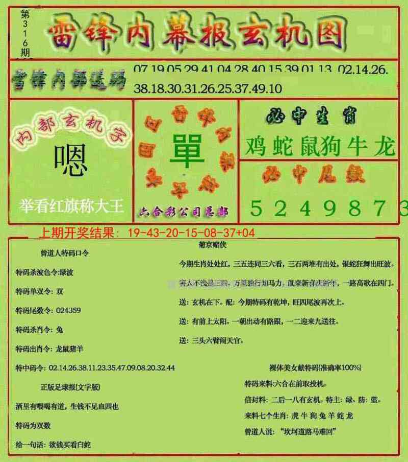 306期:男女两肖男肖+鸡蛇』开:牛17准